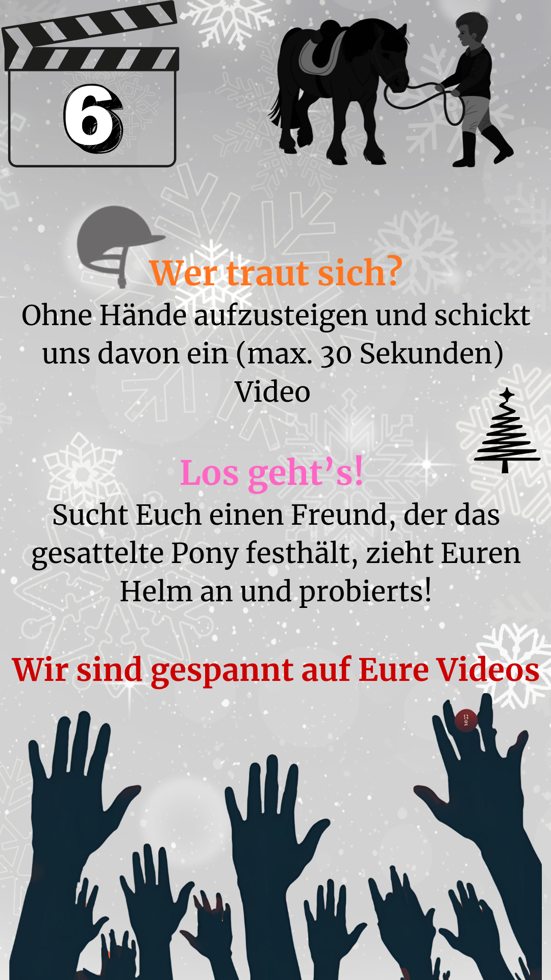 Es wäre wunderbar, wenn ihr unseren Hof im Laufe der nächsten Woche mit in einen weihnachtlichen Ponyhof verwandeln würdet.