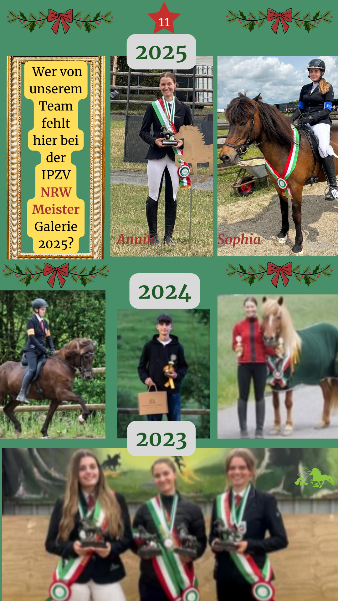 Unsere Reitschüler dürfen auch gern beim Schmücken helfen – vielleicht mit einem selbstgebastelten Strohstern, einer kleinen Lichterkette oder etwas Ähnlichem. Eure Reitlehrer finden gemeinsam mit Euch einen schönen Platz zum Aufhängen: in der Putzecke, an der Schulpferde-Sattelkammer oder wo es sonst gut passt. Bitte macht anschließend ein Foto davon und schreibt Euren Namen dazu, damit wir alles gut zuordnen können.