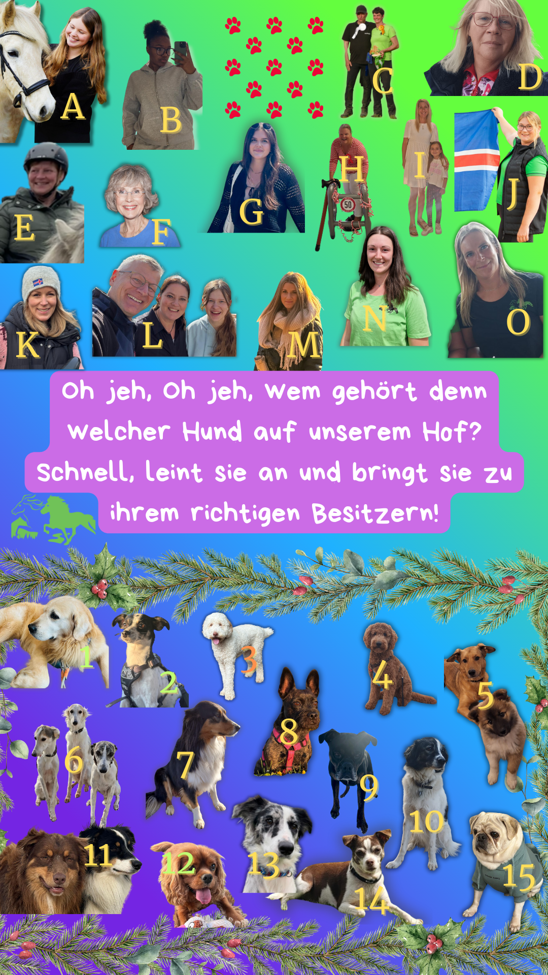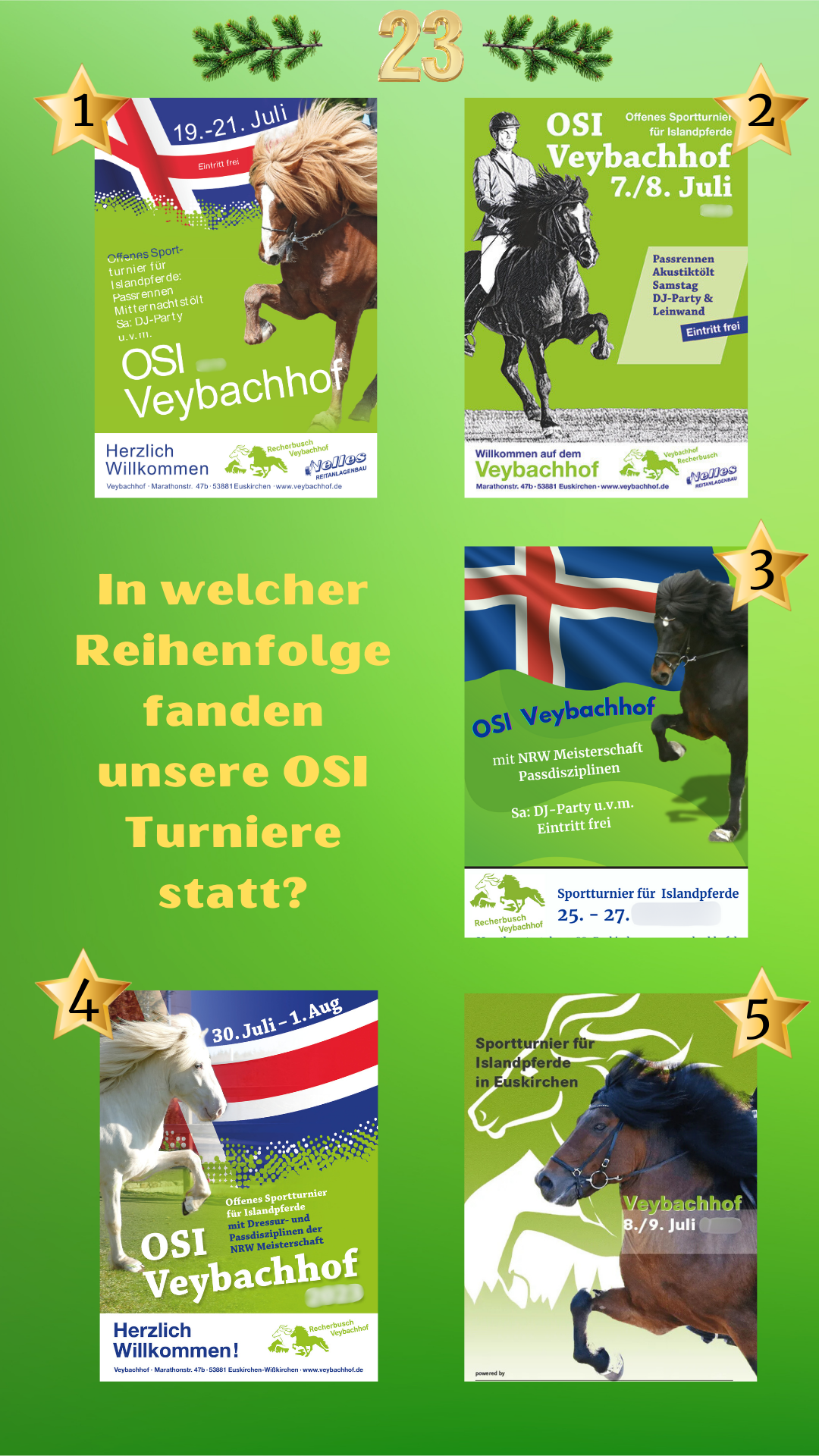Die Lösungen sowie die Vornamen von acht Teilnehmer, die das "Türchen" erfolgreich gelöst haben (bei mehreren richtigen Antworten entscheidet die Losfee), werden hier auf dieser Webseite (https://www.veybachhof.de/adventskalender) veröffentlicht. Die Genannten dürfen sich in Daggis Häuschen ein kleines Leckerli für sich selbst und/oder das Pony abholen.